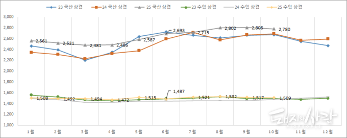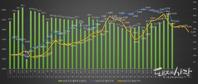 ☞2024년과 2025년 주차별 평균 돈가('24년은 같은 기간)