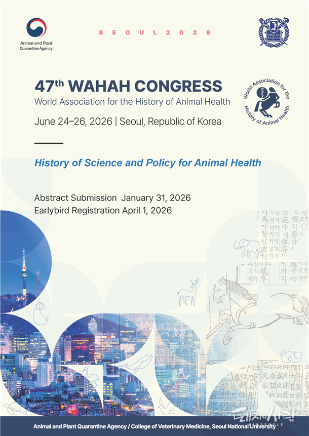 농림축산검역본부(본부장 김정희, 이하 검역본부)와 서울대학교 수의과대학은 내년 6월 24일부터 26일까지 3일간 서울대학교에서 ‘제47회 세계동물보건역사학회(WAHAH, World Association for the History of Animal Health, 구. WAHVM) 학술대회’를 공동 개최한다고 전했습니다.