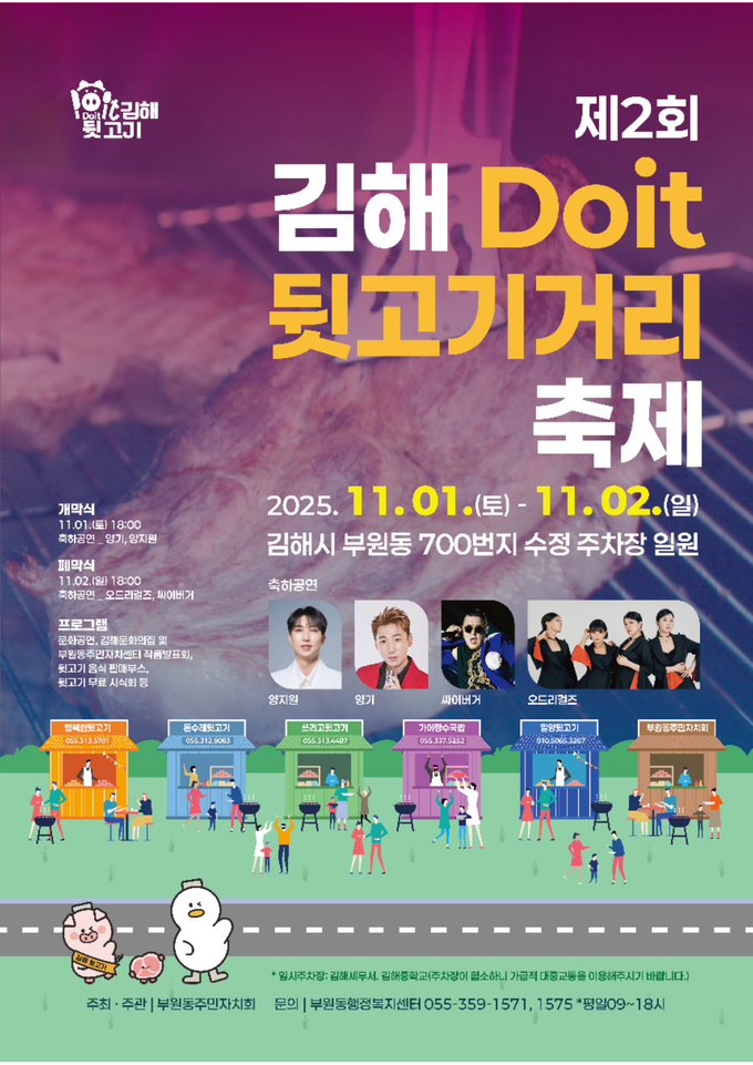 김해시는 11월 1일부터 2일까지 부원동 700번지 수정주차장과 인근 도로 일원에서 ‘제2회 김해Doit 뒷고기거리 축제’를 개최한다고 29일 밝혔습니다. 부원동 주민자치회가 주최·주관하는 이번 행사는 지역 상권을 활성화하고 김해 뒷고기 문화를 알리기 위해 지난해 처음 시작됐으며, 첫해 약 4천여 명이 방문하는 등 호응을 얻어 올해 시민 참여형 축제로 확대됐습니다.