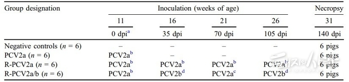 이 가설을 평가하기 위해 11주령 SPF(특정 병원체 무균) 돼지 24마리를 4가지 처리군에 무작위로 배정했다; 음성 대조군, PCV2a 1회 접종, 1회 접종 후 동종 PCV2a 균주 재접종, 또는 이종 균주(PCV2a, PCV2b) 반복 접종. 돼지는 접종 후 140일(dpi)까지 매일 임상증상을 평가했다. 혈청 샘플은 dpi 0에서 14까지 이틀에 한 번씩 채취했고 그 이후에는 매주 채취했다.