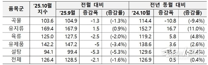 한편 2025년 10월 세계식량가격지수는 126.4포인트를 기록, 전월(128.5포인트) 대비 1.6% 하락했으며 두 달 연속 내림세가 이어졌습니다. 품목군별로 곡물, 육류, 유제품, 설탕 가격은 하락, 유지류 가격은 상승하였습니다.보다 자세한 사항은 FAO 홈페이지(바로가기)에서 확인할 수 있습니다.