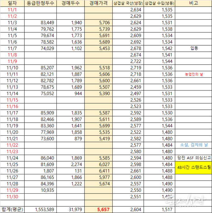 ※ 11월 24일자 주간 돼지고기 시황(출처 한국육류유통수출협회)