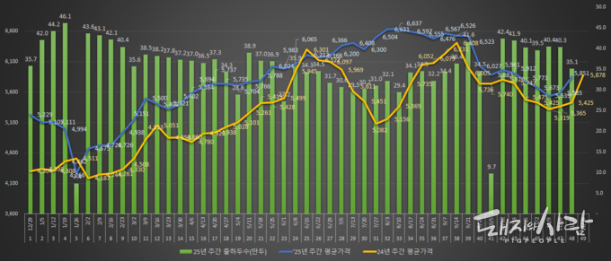 ☞2024년과 2025년 주차별 평균 돈가('24년은 같은 기간)