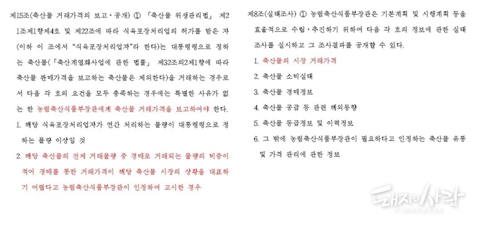 반면 이번 문대림 의원 발의안은 농식품부 장관이 축산물의 시장 거래가격을 포함한 정보를 의무적으로 실태조사하도록 하고, 결과를 영업비밀을 침해하지 않는 범위에서 공개할 수 있도록 했습니다(제8조). 자료 제출 요청 대상도 관계 부처·지자체·공공기관뿐 아니라 축산업 경영자와 축산물 유통업자로 폭넓게 규정해 실제 거래자료를 상시적으로 확보할 길을 열어주었습니다.