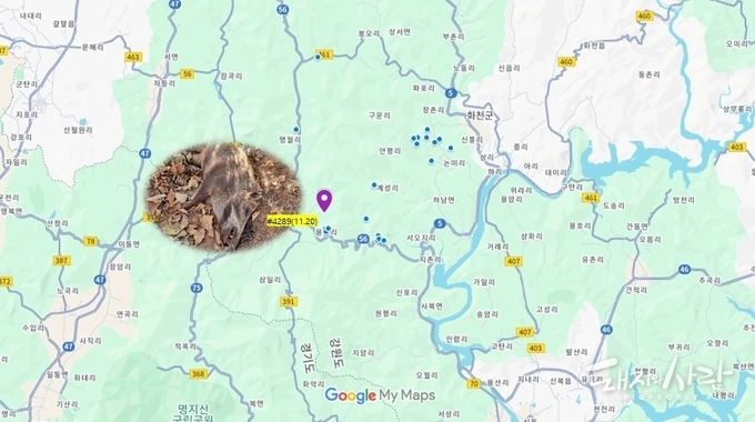 지난달 3개월 만에 다시 출현한 ASF 감염멧돼지가 이제는 거의 매일 추가 발견되고 있습니다. 20일에도 한 마리 새롭게 확인되었습니다. 국립야생동물질병관리원에 따르면 해당 감염멧돼지는 24개월령 암컷으로 지난 14일 강원도 화천군 사내면 용담리 소재 야산에서 수색을 통해 폐사체로 발견되었습니다. 발견 당시 폐사한지 5일이 경과한 것으로 알려졌습니다. 20일 검사 결과 ASF 양성개체로 확진되었습니다(#4289). 이로써 지난 10월 28일 이래 ASF 감염멧돼지 발견 마릿수는 모두 32마리(화천 24, 춘천 7, 원주 1)로 늘어났습니다. 하루 1.3마리꼴입니다.