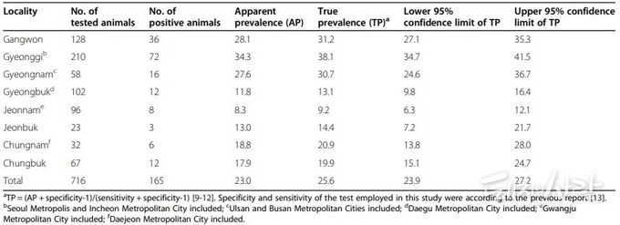 연구 결과 임상적으로 건강한 야생멧돼지 716마리 중 165마리에서 L. intracellularis 항체가 관찰되었다. 표본에서 직접 계산된 전체 겉보기 유병률과 검사법의 정확도를 기반으로 계산된 실제 유병률은 각각 23.0%(95% 신뢰구간: 20.0-26.3%)와 25.6%(95% 신뢰구간: 23.9-27.2%)였습니다. 혈청학적으로 양성인 동물은 검사 대상 모든 지역에서 발견되었다.