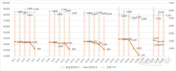 ◆ 이달의 일별 도매가격, 경매두수, 등급판정두수 추이
