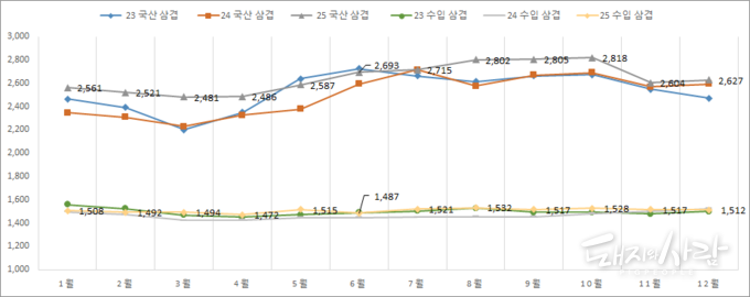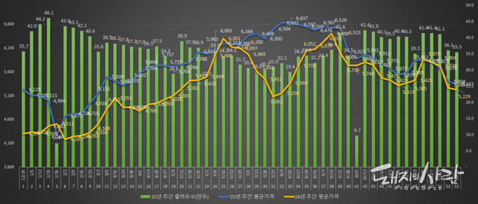 ☞2024년과 2025년 주차별 평균 돈가('24년은 같은 기간)