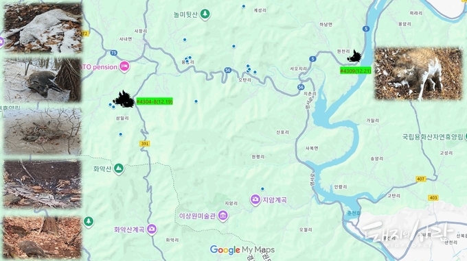 강원도 화천에서 ASF 감염 야생멧돼지 폐사체 6마리가 추가됐습니다. 19일 5마리, 21일 1마리로, 모두 화천 지역에서 발견됐습니다. 폐사 후 경과 기간은 최소 3일에서 최장 40일 수준으로 추정되고 있습니다. 먼저 19일 추가 5마리(#4304~4308)는 화천군 사내면 삼일리 일대 야산 수색 과정에서 확인됐습니다. 21일 확진 1마리(#4309)는 화천군 하남면 원천리 야산에서 신고되었습니다. 이로써 12월 들어 확인된 ASF 감염멧돼지는 총 19마리로 늘었습니다. 모두 화천에서만 나와 주목됩니다.