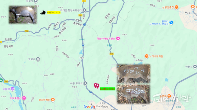 충북 충주에서 ASF 감염멧돼지 2마리가 확인됐습니다. 국립야생동물질병관리원에 따르면 해당 멧돼지들은 24개월령 암컷과 8개월령 수컷으로 지난 20일 충주시 소태면 동막리 일대 야산에서 총기 포획되었습니다. 24일 정밀검사에서 양성개체(#4311, 4312)로 진단되었습니다. 이번 감염멧돼지는 충북 전체로는 지난 6월 단양 이후 6개월 만의 추가 검출입니다. 충주에서는 지난 '24년 5월 이후 1년 7개월 만입니다. 특히 충주 포획 지점은 지난달(11.13일) 강원 원주에서 감염멧돼지(관련 기사)가 포획된 지점과 약 8km 떨어진 곳으로 파악돼, 인접 지역으로의 추가 확산 가능성에 대한 우려가 커지고 있습니다. 한편 24일 강원도 화천에서도 감염멧돼지 1마리(폐사체, #4313)가 추가되었습니다. 이로써 이달 감염멧돼지 발견건수는 23건(마리)으로 늘어났습니다.