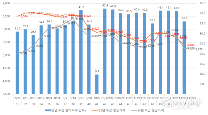 크리스마스가 있었던 지난주(12월 21~27일) 국내 돼지고기 도매시장은 2주 연속 뚜렷한 하락세를 보였습니다(관련 기사). 축산물품질평가원에 따르면 이 기간 전국에서 출하된 돼지는 총 36만1천 마리로 집계됐으며, 평균 도매가격(제주 및 등외 제외)은 kg당 5,404원을 나타냈습니다. 이는 전주 대비 274원(4.8%) 떨어진 수치입니다. 올해 3월 이래 가장 낮은 수준입니다. 다만 지난해 같은 기간과 비교하면 135원(2.6%) 높은 가격입니다. 관련해 한국육류유통수출협회는 주간시황에서 연말 소비 특수에도 불구하고 정육점과 외식 수요가 기대에 못 미친 가운데, 일부 할인 행사 중심의 제한적 수요만 있었고 정육류 모두 약보합세를 보이며 가격 하락 압력이 작용한 것으로 분석했습니다. 한편 29일 평균 도매가격은 5,351원입니다. 이번주에도 추가 하락이 예상되고 있습니다.