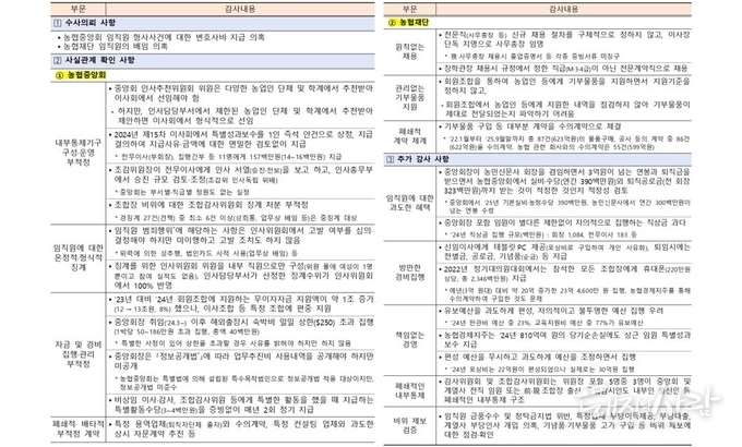 계약 방식에서도 퇴직자 단체 관련 업체와 관행적으로 수의계약을 맺거나, 농협재단의 사무총장을 이사장 단독 지명으로 채용하는 등 폐쇄적인 운영 사례가 다수 발견되었습니다. 재단의 경우 기부 물품이 농업인들에게 제대로 전달되고 있는지에 대한 사후 점검조차 부실했던 것으로 확인되었습니다.