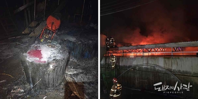 이 과정에서 양돈장 내 정화시설 포함 건물 2개 동이 전소되는 피해를 입었습니다. 인명피해는 없었습니다. 돼지피해도 없었습니다.
