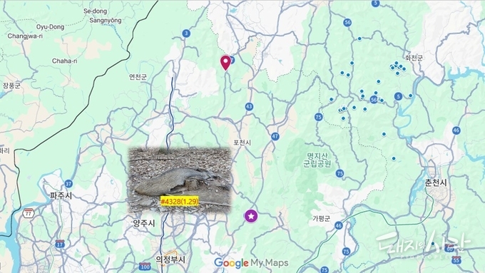 지난 24일 사육돼지에서 ASF가 발생해 긴장감이 고조된 경기 포천에서 이번에는 바이러스에 감염된 야생멧돼지가 확인됐습니다. 국립야생동물질병관리원에 따르면, 해당 야생멧돼지는 12개월령 암컷으로 지난 28일 포천시 내촌면 소학리 소재 야산에서 폐사체로 발견되었습니다. 발견 당시 죽은지 14일이 경과한 것으로 알려졌습니다. 29일 정밀검사 결과 ASF 양성으로 진단되었습니다(#4328). 포천 내 감염멧돼지 사례는 지난 '22년 3월 이후 약 3년 10개월 만입니다. 이번 ASF 발생농장과의 거리는 약 33km입니다. 참고로 지난해 10월 말부터 강원도 화천·춘천에서 다수의 감염멧돼지가 추가되었는데 포천 발생농장과 가장 가까운 것은 약 24km 정도 거리입니다.
