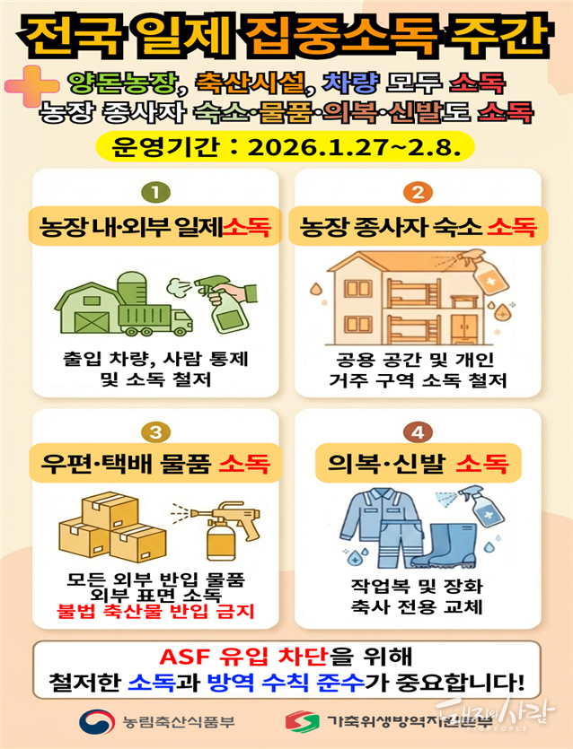 구체적으로 현재 추진 중인 전국 일제 집중 소독주간(1.27.~2.8.)의 운영 실적을 중점적으로 점검할 예정입니다. 돼지농장과 축산시설, 출입 차량·사람·물품 전반에 대한 일제 소독이 이루어지며, 농장 종사자 숙소·의복·신발 및 외부 반입 물품에 대해서도 소독이 철저히 이행되도록 관리할 계획입니다.