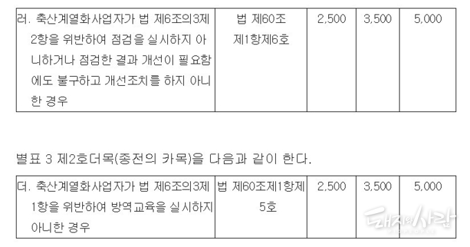 전국이 ASF와 구제역 등 가축전염병에 관심이 모두 쏠린 가운데 농림축산식품부가 지난달 27일 '가축전염병 예방법 시행령' 일부개정령안을 입법예고했습니다(공고 보기). 관련 위반 시 양돈농가에 부과되는 과태료가 지나치게 과도한 것이 뒤늦게 확인되어 향후 공포 후 시행 과정에서 적지 않은 논란이 일 전망입니다. 국회를 통한 법 개정이 필요해 보입니다.