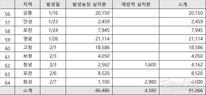 강릉(2만 마리), 영광(2만1천 마리), 고창(1만8천 마리), 포천(1만6천 마리, 2곳 합계) 등 대형농장이 잇따라 바이러스에 뚫리면서 피해 규모가 걷잡을 수 없이 커진 탓입니다.
