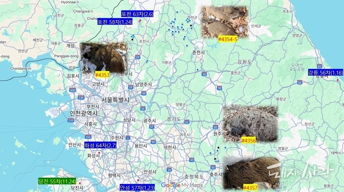 오늘(11일), 경기와 강원, 충북 등에서 ASF 감염멧돼지 5마리가 추가로 확인되었습니다. 국립야생동물질병관리원에 따르면 이번에 추가된 검출 사례는 강원 원주 1건(#4353), 화천 2건(#4354-5), 경기 포천 1건(#4356), 충북 충주 1건(#4357)입니다. 특정 지역에 국한되지 않고 경기 북부부터 강원 내륙, 충북 북부에 이르기까지 광범위한 지역에서 동시다발적으로 확인되었습니다. 검출된 개체들은 6개월령의 어린 멧돼지부터 30개월령의 성체까지 다양합니다. 야생생태계 내에 바이러스 오염원이 이미 깊숙이 자리 잡고 있음을 시사합니다. 또한, 농장으로의 유입 가능성이 그 어느 때보다 높은 상황임을 보여줍니다. 이번 추가로 이달 누적 감염멧돼지 검출건수는 총 27건으로 늘어났습니다. '24년 7월(41건) 이후 최대치를 기록할 것이 확실해 보입니다(관련 기사).