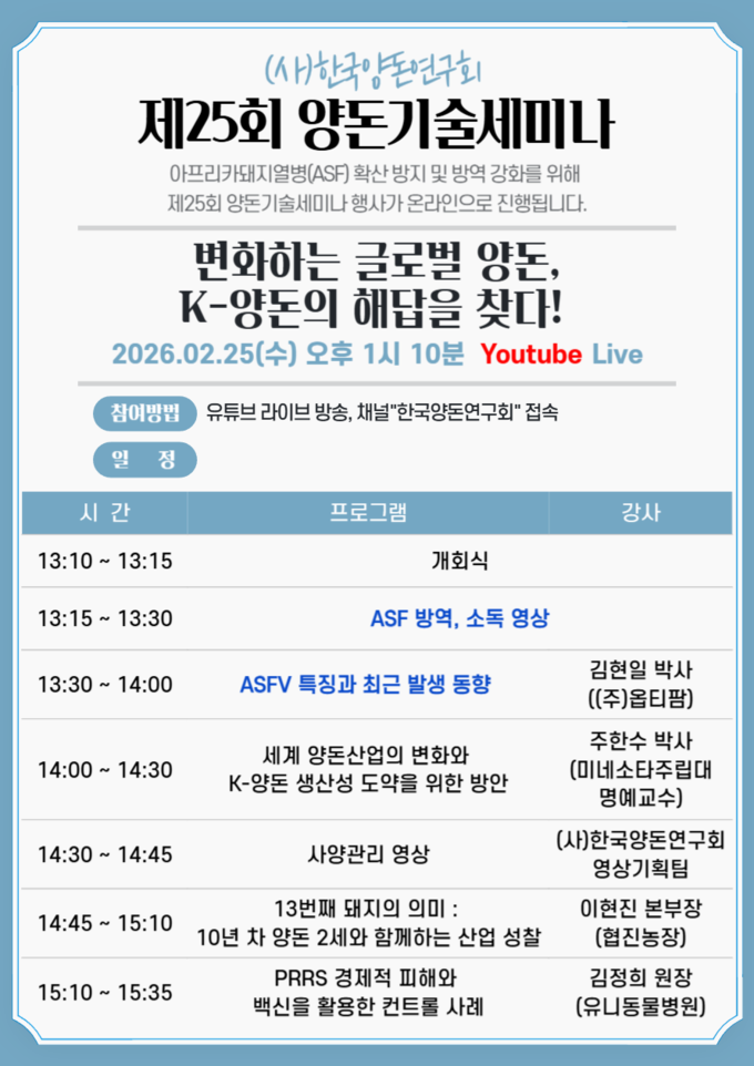 연구회는 “ASF 확산 방지와 방역 강화를 위해 비대면 방식으로 전환했다”며 “현장 대면이 어려운 만큼 온라인 생중계를 통해 정보를 공유하고, 산업 대응 역량을 높이겠다”는 취지로 안내했습니다.