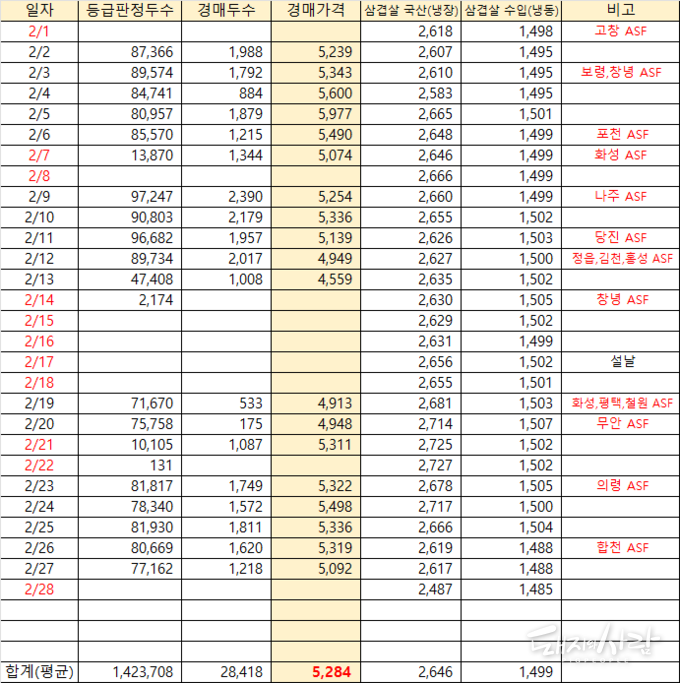 ※ 2월 9일자 주간 돼지고기 시황(출처 한국육류유통수출협회)
