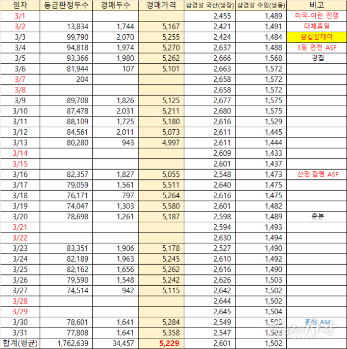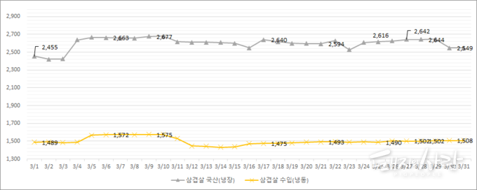 ※ 3월 3일자 주간 돼지고기 시황(출처 한국육류유통수출협회)