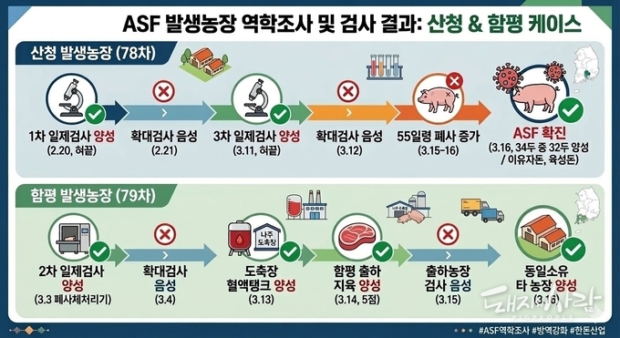 여하튼 산청·함평 확진 사례 모두 그간 추정되었던 '검사 과정의 오류'도, '바이러스의 변이(만성형)'도 아니었습니다. ASF 바이러스 특유의 '느린 전파성'을 간과한 채, 현장 전문성이 결여된 '기계적 시료 채취'가 불러온 인재(人災)라는 지적이 나옵니다.