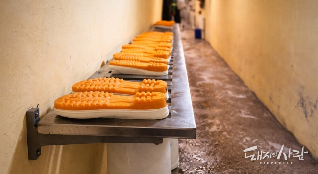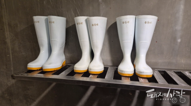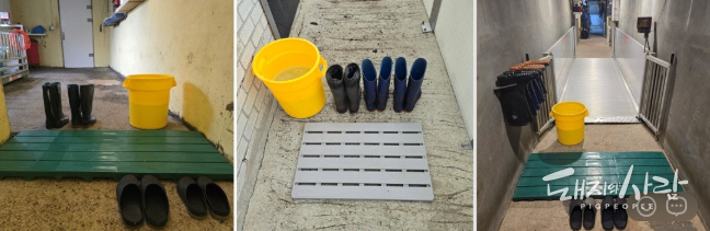 그동안 로즈팜은 유럽의 방식을 차용해 바닥에 플라스틱 매트를 깔고 신발을 갈아신으며 돈방을 출입해 왔습니다. 하지만 매일 복도 소독을 실시하는 과정에서 매트 자체가 관리가 번거롭고, 정리되지 않은 실내화와 장화가 동선을 방해하는 등 현장의 불편함이 적지 않았습니다. 이를 개선하기 위해 김 대표는 스테인리스 30x50 각 파이프를 활용해 맞춤형 거치대를 새로 제작했습니다.