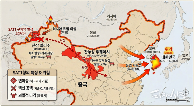 이번 사태의 배후를 두고 외신들은 러시아로부터의 유입설을 강력하게 제기하고 있습니다. 발병 지역인 신장 일리주가 러시아 및 중앙아시아 국경과 맞닿아 있다는 점, 그리고 최근 중동 일대에서 SAT1형 구제역이 확산 추세였다는 점이 근거로 꼽힙니다. 하지만 현재까지 러시아 당국은 자국 내 구제역 발생 사실을 공식적으로 부인하고 있는 것으로 알려졌습니다.