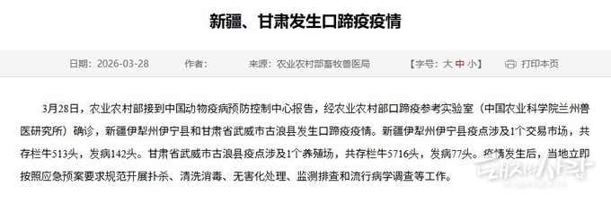 중국 농업농촌부는 지난 3월 28일, 신장 일리주 이닝현과 간쑤성 우웨이시 구랑현에서 구제역(FMD)이 발생했다고 홈페이지를 통해 공식 발표했습니다.