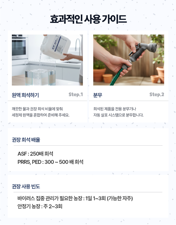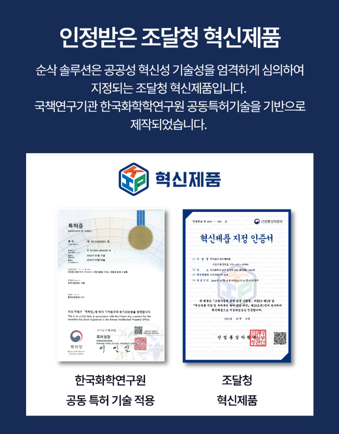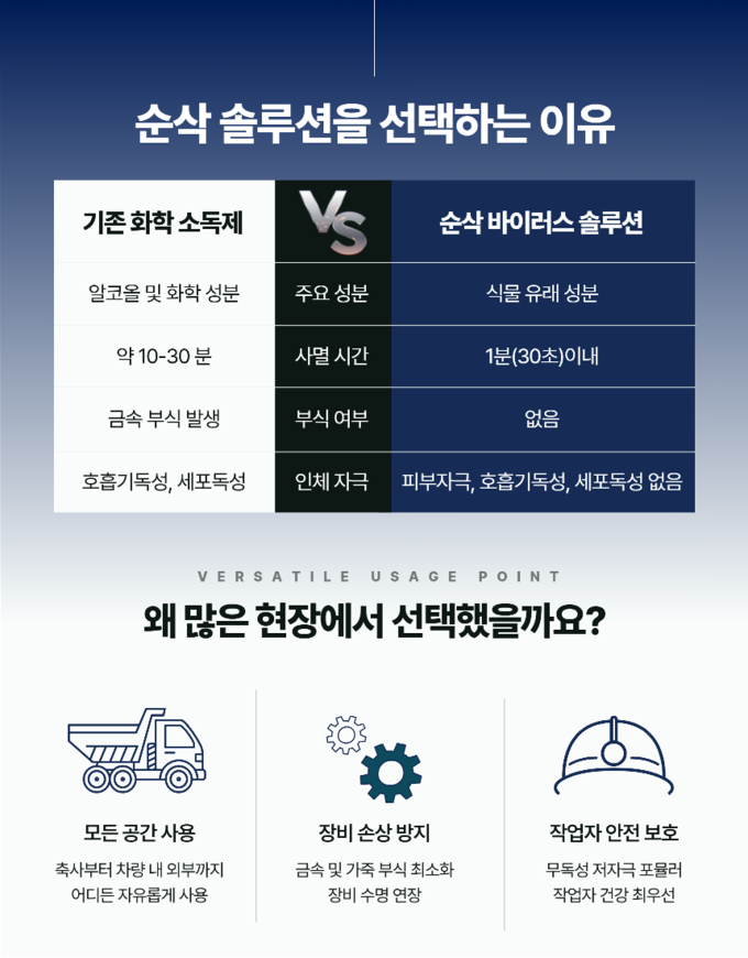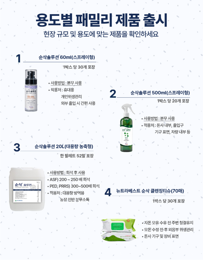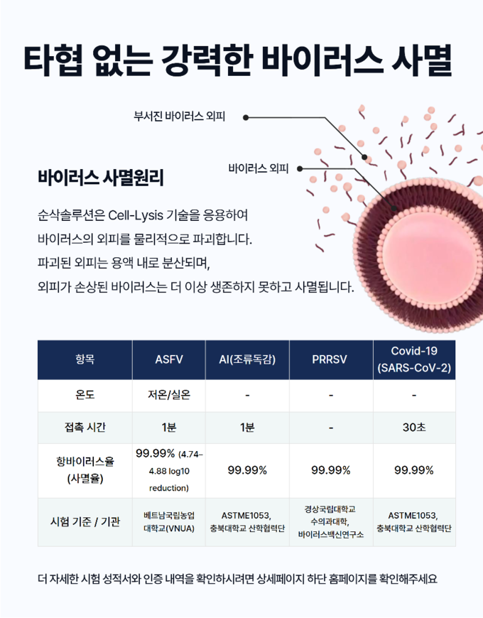 '순삭솔루션'은 다릅니다. 식물 유래 비이온성 천연물질이 주성분인 중성(pH7)으로, 바이러스 외피에 작용해 씻어내듯 사멸시키는 신개념 바이러스 솔루션입니다.