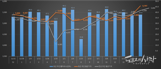 축산물품질평가원에 따르면 지난 3월 29일부터 4월 4일까지의 주간 평균 도매가격은 5,383원(전주 대비 166원 증가)을 기록한 데 이어, 지난주인 4월 5일부터 11일까지는 5,797원으로 일주일 사이 400원 이상 급등했습니다. 2주 연속 큰 폭의 오름세를 보이며 시장의 상방 압력이 강해지는 모양새입니다.