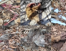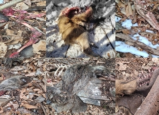 'ASF 바이러스(ASFV)'는 감염된 동물의 사체뿐만 아니라 골수에서도 장기간 전염성을 유지한다. ASFV에 감염된 사체에 대한 다양한 동물의 청소 활동은 ASFV 전파의 잠재적 위험 요인으로 여겨진다. 따라서 본 연구는 청소동물이 ASFV의 잠재적 매개체인지 확인하기 위해 수행되었다. 야생멧돼지 사체를 숲 바닥에 방치된 상태에서, 사체 분해 과정의 계절적 패턴과 이를 먹이로 삼는 청소동물의 방문 빈도를 조사했다. 성체 사체의 신선 상태에서 초기 골격화(뼈와 가죽만 남은 상태)까지 걸린 기간은 겨울철에 37.6±23.1일(n=3, 범위=11-51일)이었다. 성체 사체를 포함한 모든 사체의 신선 상태에서 후기 골격화(뼈와 일부 털만 남음)까지의 기간은 여름철에 8.3±2.5일(n=4, 범위=7-12일)이었다. 모든 세 곳의 조사 지역에서, 삵(30.3%), 큰부리까마귀(21.6%), 그리고 검독수리(18.1%)가 자주 방문하는 종들이었으며, 이는 겨울 전체 방문(343회 방문)의 10% 이상을 나타냈다. 반면 여름에는 너구리(21.9%), 흰배지빠귀(39.4%), 그리고 되지빠귀(14.7%)가 가장 빈번한 방문자들이었다. 겨울에는 까마귀나 독수리들이 사체에